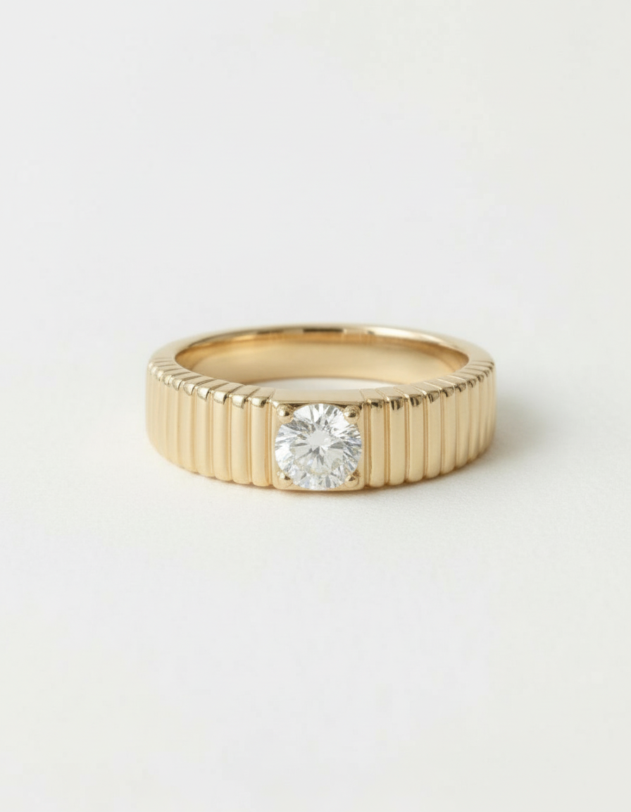 Defined by its vintage-inspired ribbed band, this 5mm ring features a prong-set 0.50ct lab-grown diamond. A fusion of structured geometry and celestial sparkle.