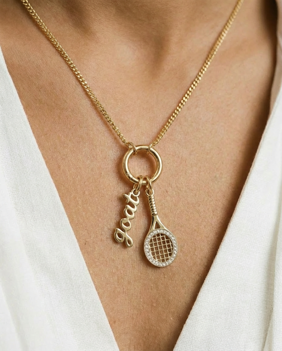 "Greatest of All Time," this piece is a playful yet bold declaration of self-confidence. Designed in a fluid, vertical script, it draws the eye downward, making it an excellent anchor piece for your charm stack. Whether you're celebrating a personal win or gifting it to the legend in your life, this charm brings the perfect amount of attitude to your Alya Stone collection.