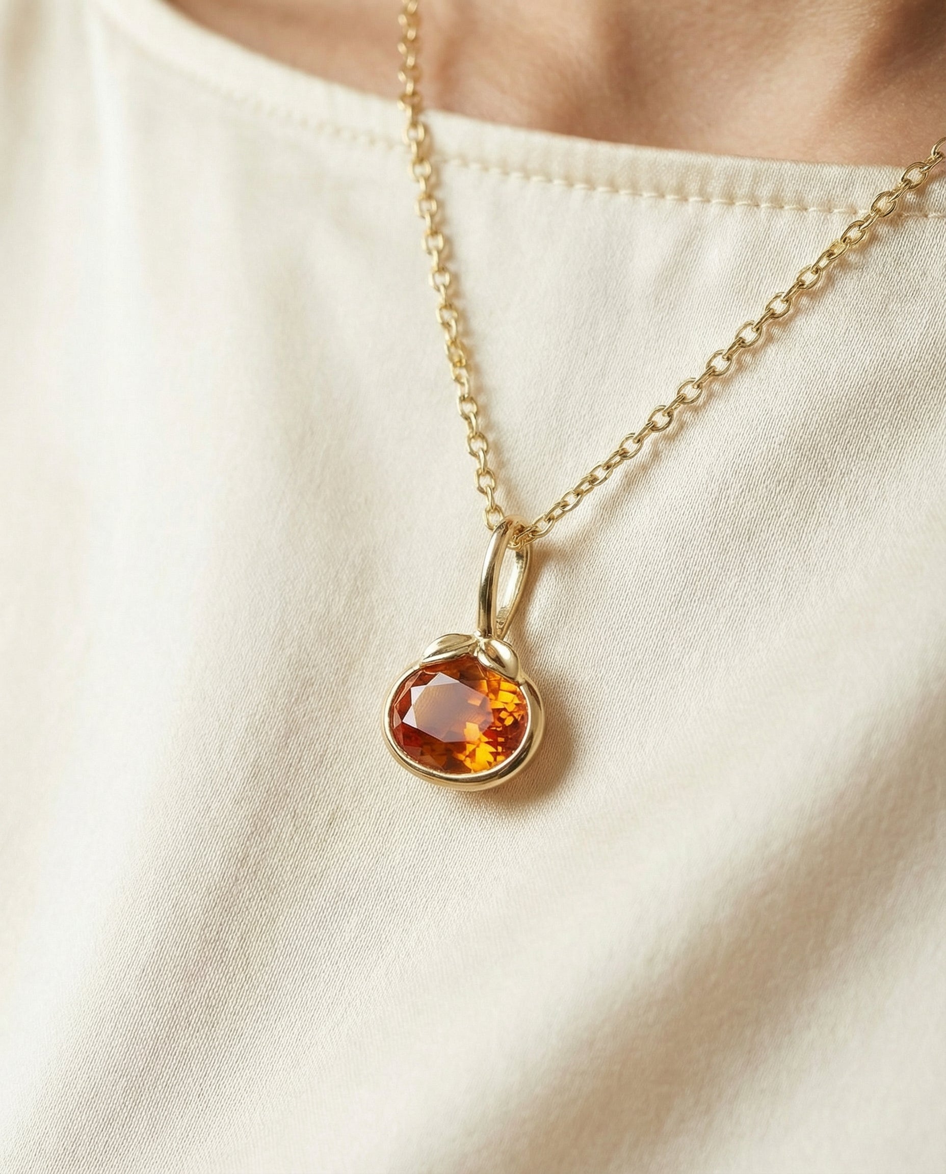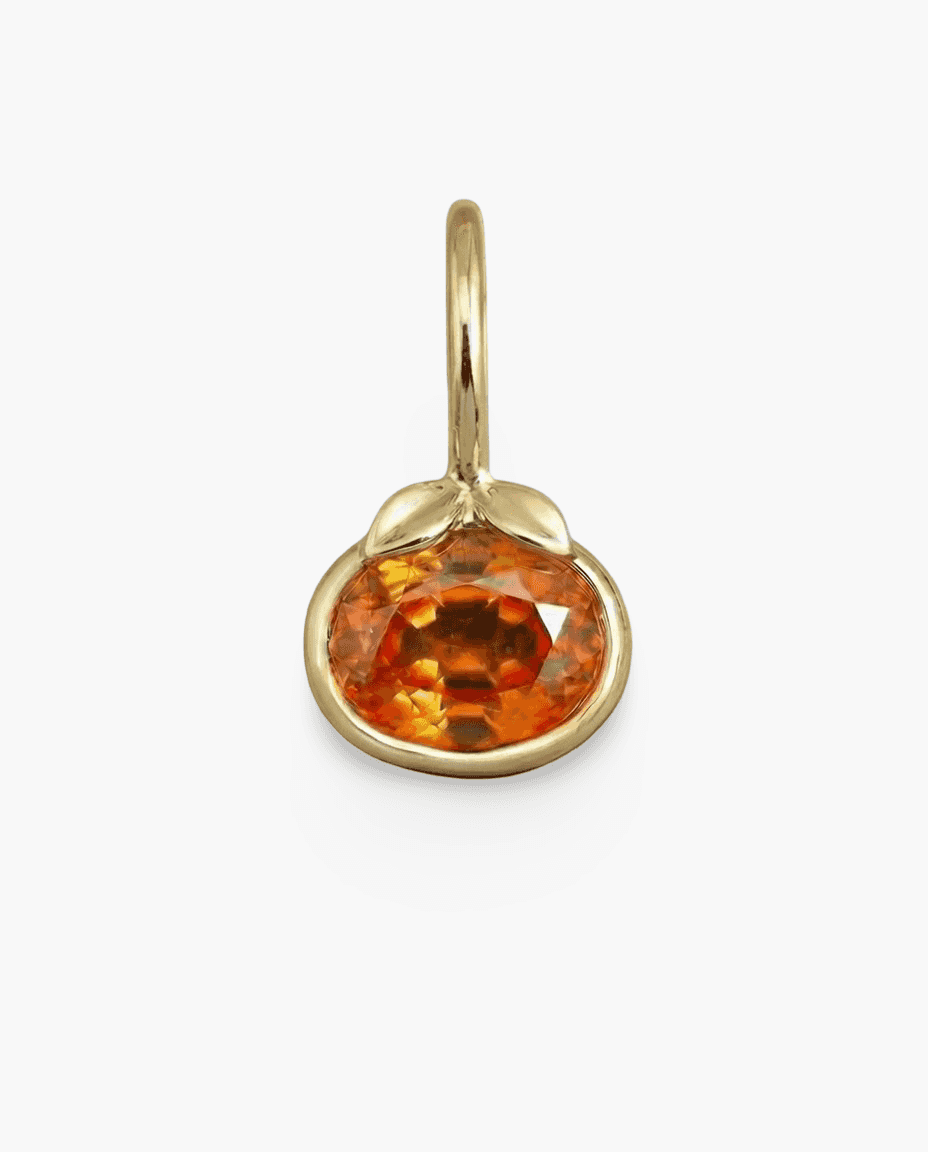 At its heart is a vibrant, oval-cut stone in a deep sunset hue, designed to catch the light with "liquid gold" energy. The piece is crowned with two hand-sculpted 9k gold leaves at the bail, capturing the organic beauty of a lucky fruit picked straight from the tree. Designed to glide seamlessly onto our signature carabiner systems or a gold chain, it’s more than just a charm—it’s a wearable wish for luck, joy, and prosperity.