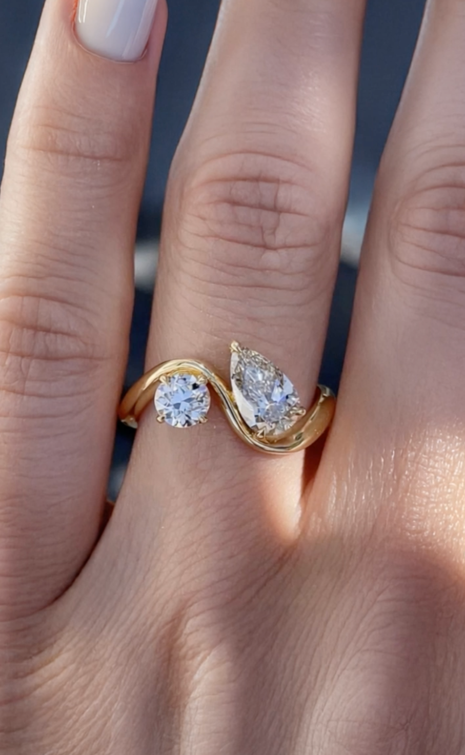 Two diamonds—a brilliant round and a teardrop pear—float above a softly undulating band. This isn’t just a Toi et Moi; it’s a conversation between two stones, with the organic band as their dance floor.