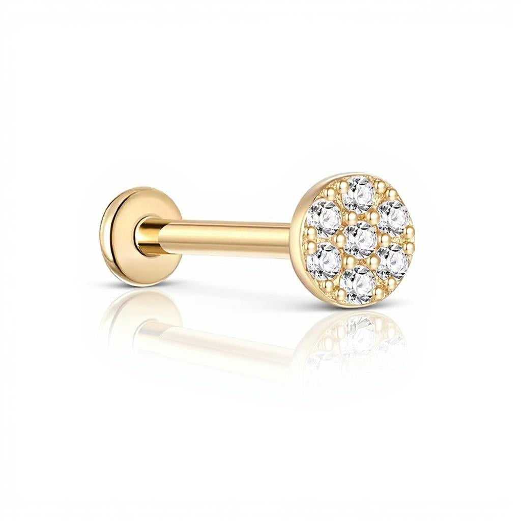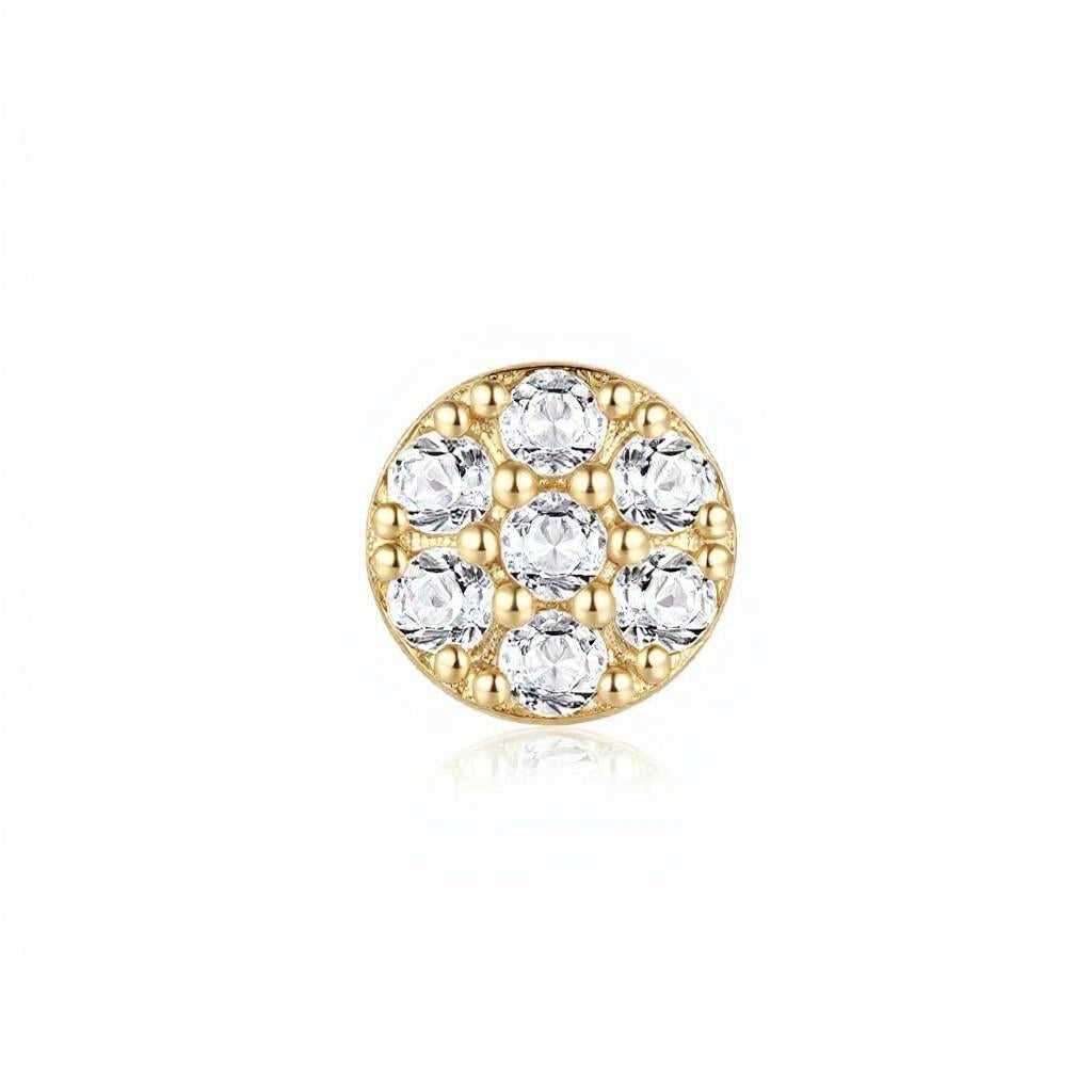 A fresh spin on a classic. This disc-shaped stud dazzles with a full pavé of lab diamonds, delivering bold sparkle in a compact, comfortable flat-back design. Perfect for everyday luxury.