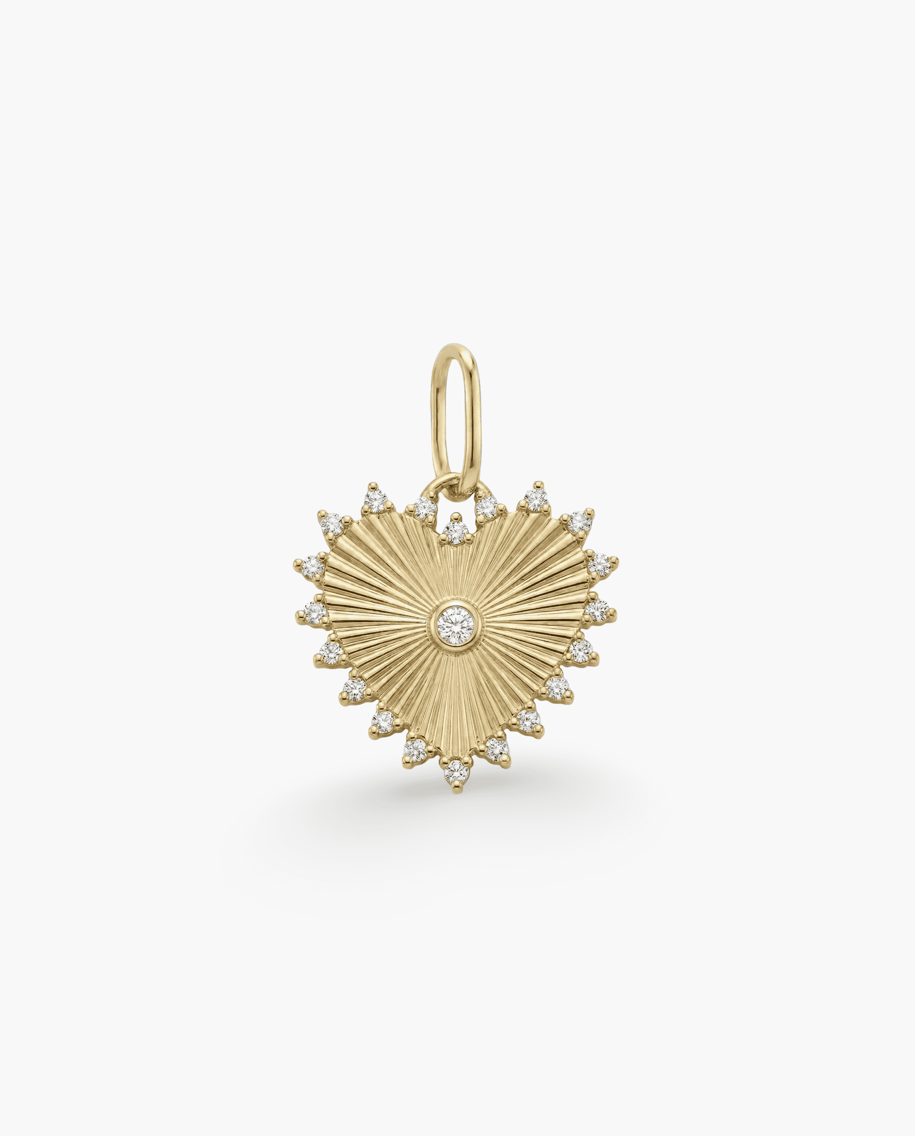 A celestial take on a classic symbol. This gold heart features a dramatic fluted "sunbeam" texture radiating from a central bezel-set lab grown diamond.