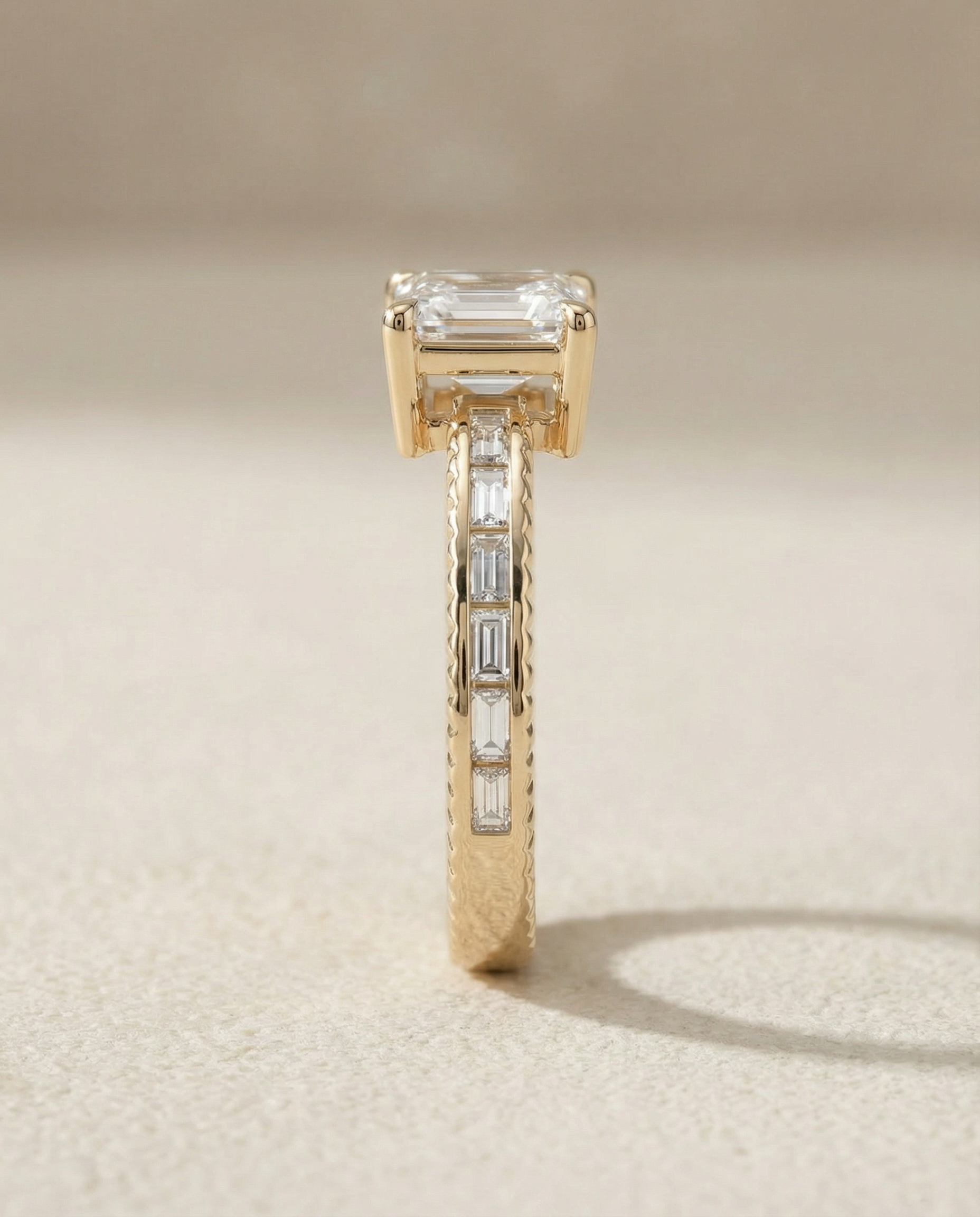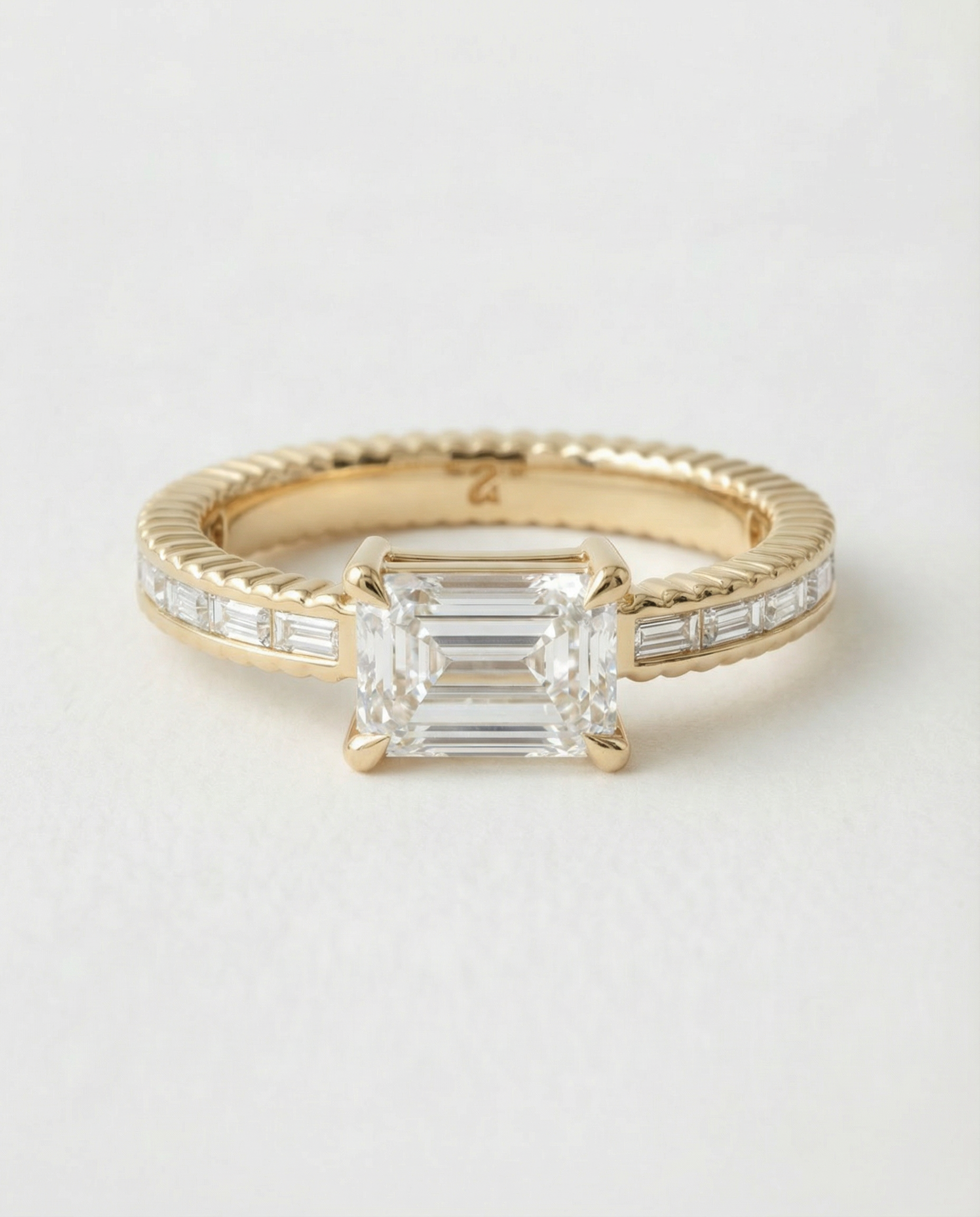 An emerald-cut diamond cradled between baguettes, all set into softly ribbed metal that catches the light like vintage lace. Time-worn charm meets modern resilience.